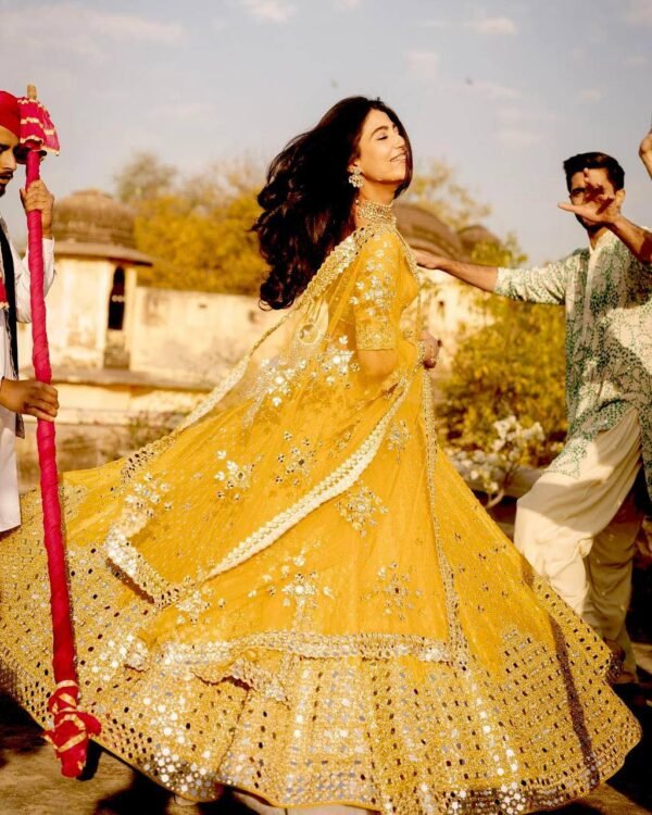 Brighten your Haldi and Mehendi ceremonies with this exclusive lehenga set, designed in lightweight georgette for a festive, flowy look. The lehenga features beautiful paper mirror work all over with a generous 3.5 meter flair, creating a stunning twirl and eye-catching shine at every step.